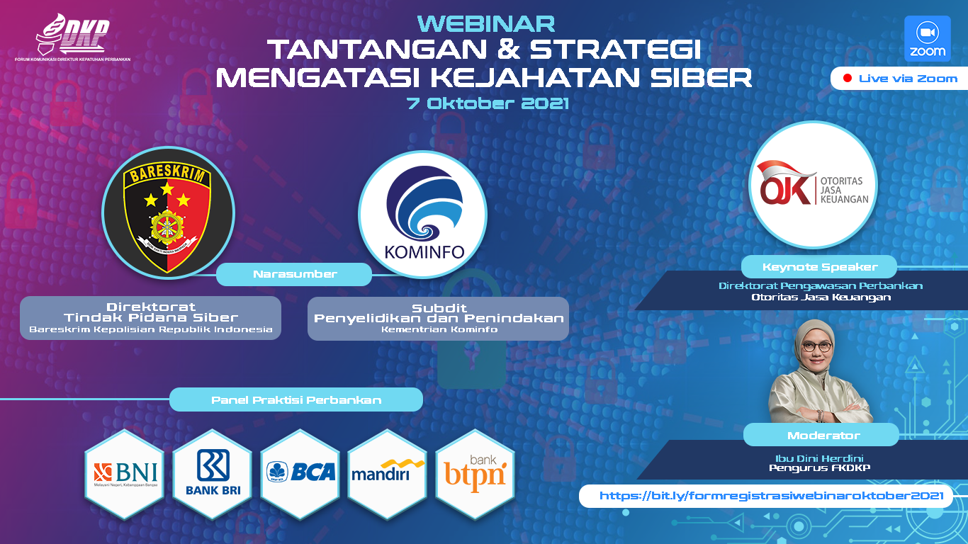 Webinar ini merupakan salah satu agenda rutin FKDKP yang bertujuan menjadi forum berbagi informasi dan berdiskusi bagi para anggotanya. Tema Webinar kali ini diangkat banyaknya kejadian tindak pidana siber dalam beberapa bulan terakhir yang tidak hanya merugikan nasabah tetapi juga bank sebagai penyedia layanan.